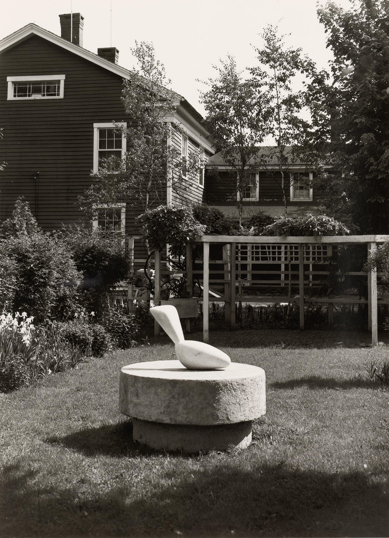 Dreier in Laurel Manor’s elevator designed by Duchamp, Fernand Leger's painting, "Three Women by a Garden" (1913) is installed on the staircase wall center. Constantin Brancusi's "Yellow Bird (L'oiseau d'or)" (1919) is in the far left corner, photographed in 1948.