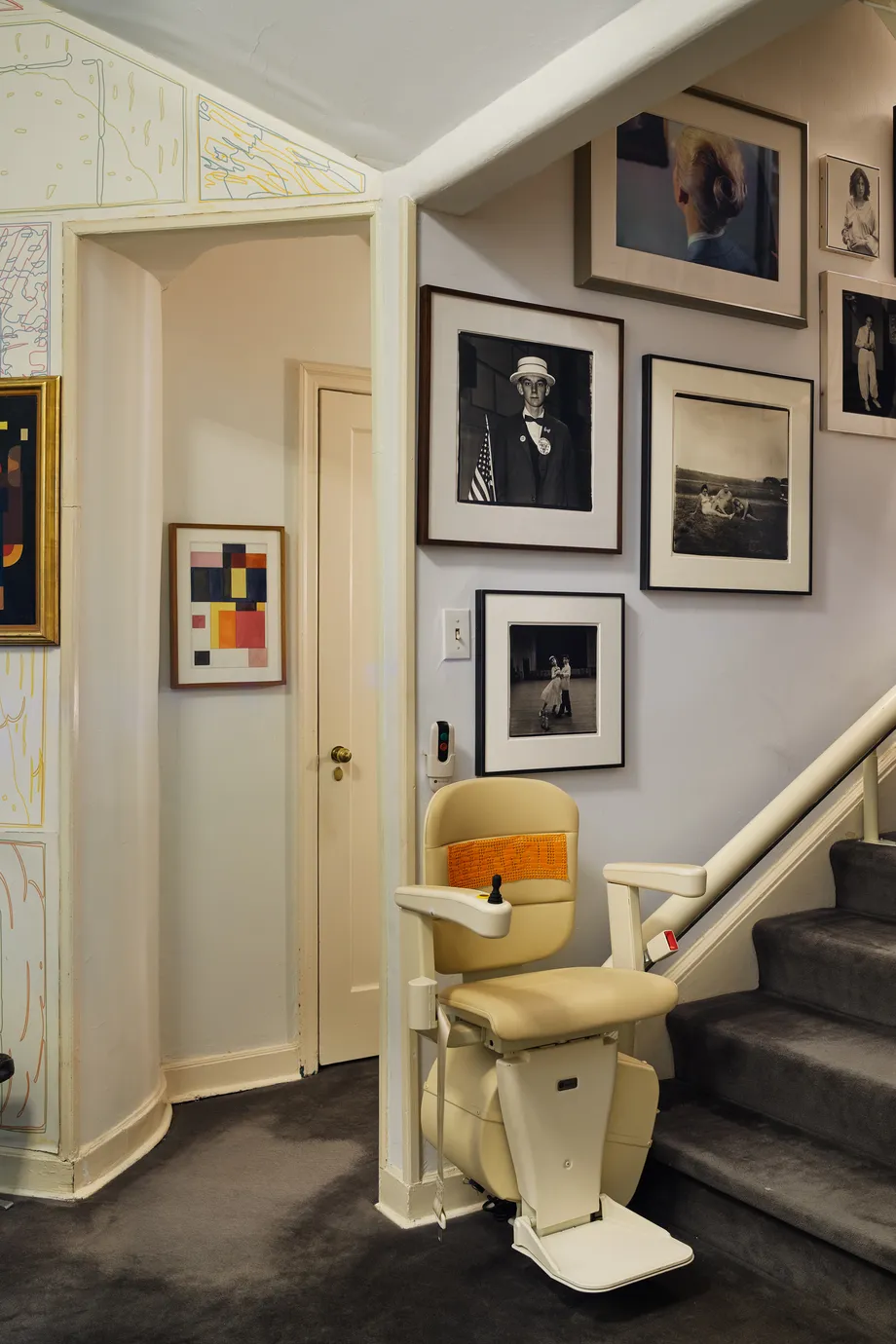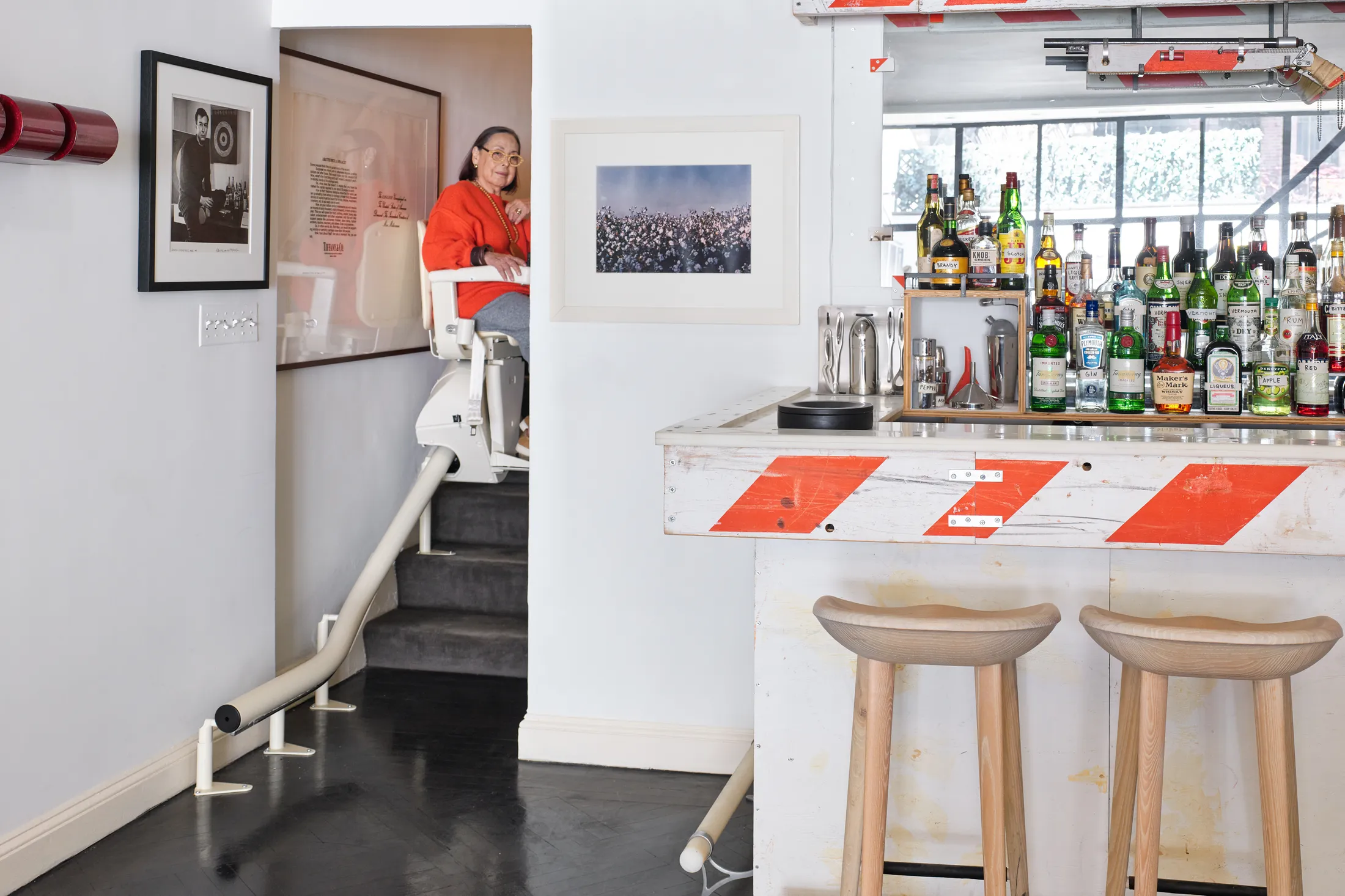Jakobson in her Dutch-made stairlift. Tom Sachs created the bar from Con Ed barricades after she sold her dining-room furniture at Christie’s. 8/10