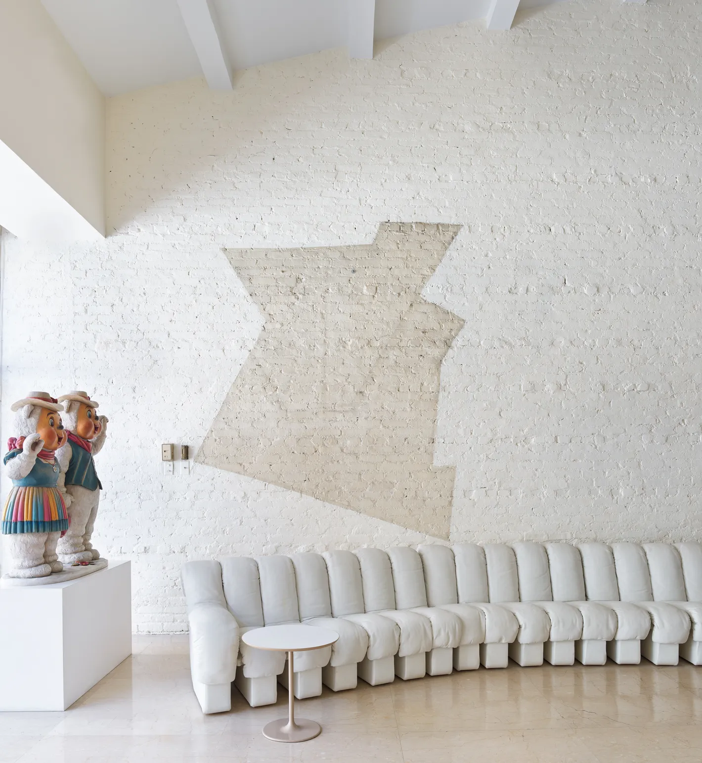 The living room features an outline of Frank Stella’s “Felsztyn III” (1971), which was sold in a 2005 Christie’s auction. Jeff Koons’s “Winter Bears” (1988) observe a 1972 de Sede modular sofa. 3/10