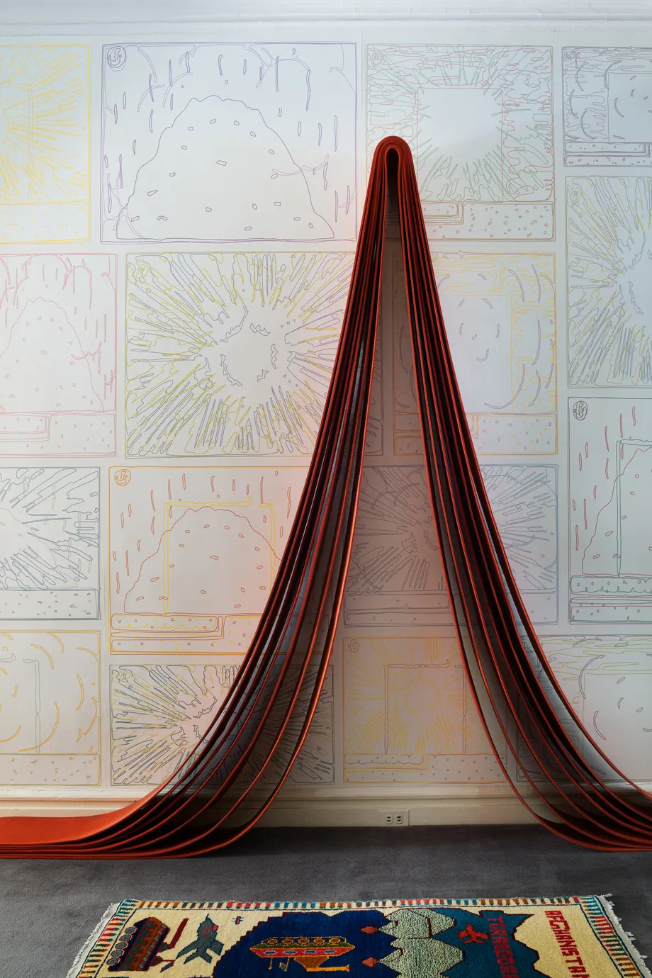 A Robert Morris felt installation which Jakobson bought in 1970 and “has never moved.” The whimsical wallpaper is by Peter Halley. 2/10