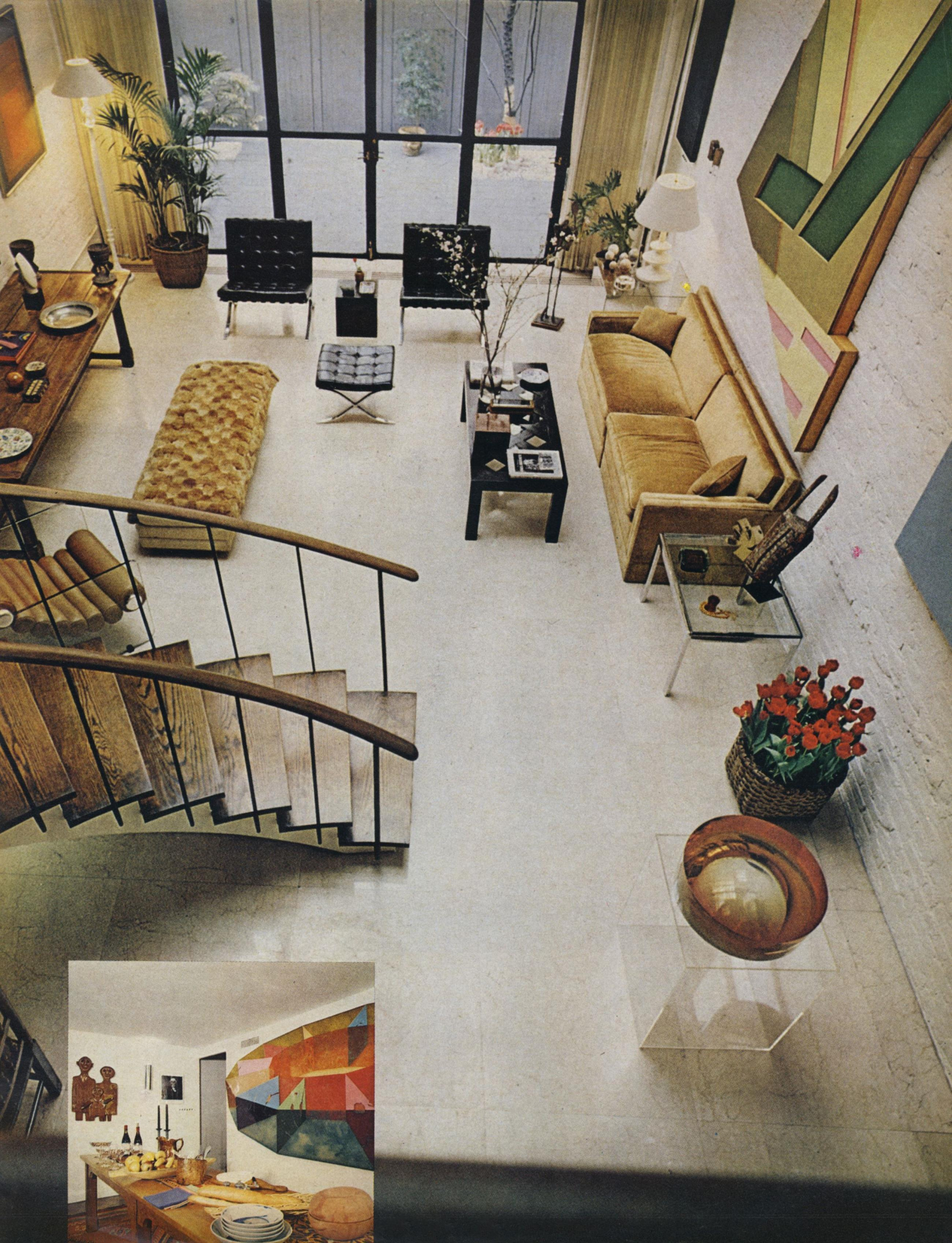An overhead view of the living room in 1973, showing Frank Stella's Felsztyn III over the sofa; an Ad Reinhardt triptych; one of Cy Twombly's Blackboard Series and one of Josef Albers' Homage to the Square. 10/10
