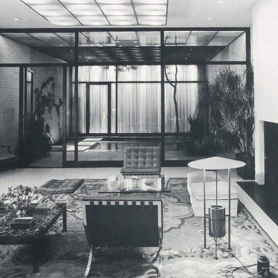 A view from the living room featuring copper-threaded chenille curtains woven by Anni Albers and Barcelona chairs designed by Mies van der Rohe and Lilly Reich. 1/5