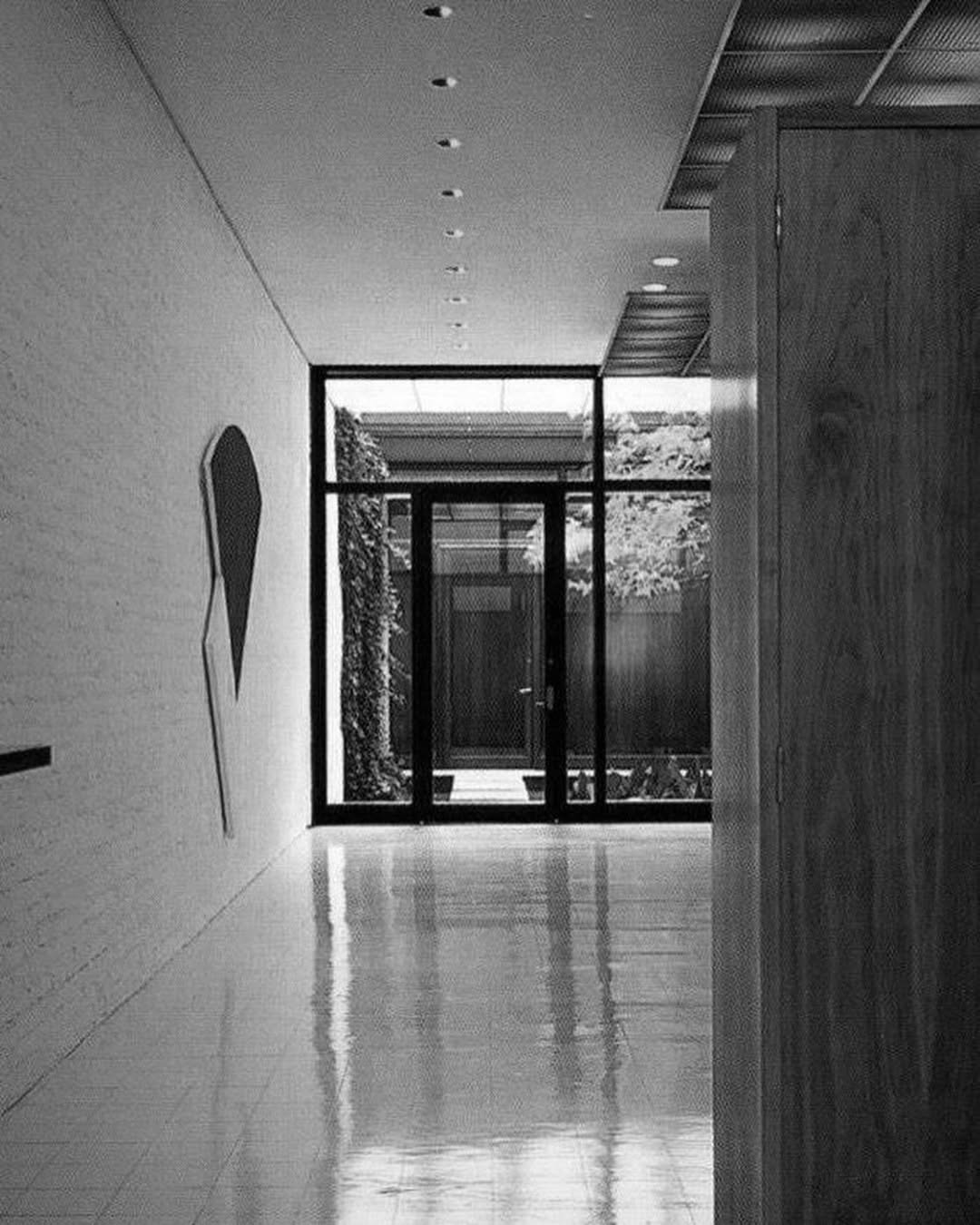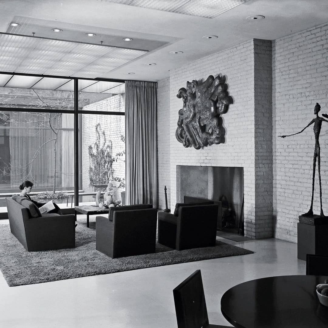 Johnson’s Guest House would be one of the earliest buildings in New York City to reflect modernist design and the influence of German-American architect Ludwig Mies van der Rohe. Uninterrupted brick walls painted white extended from the living area through the courtyard, providing a neutral backdrop for Blanchette’s art collection which by then included works by Alberto Giacometti, Hans Arp, Robert Motherwell, and more. Vertical windows looked into an interior courtyard with a meditative pond that extends the full width of the building.