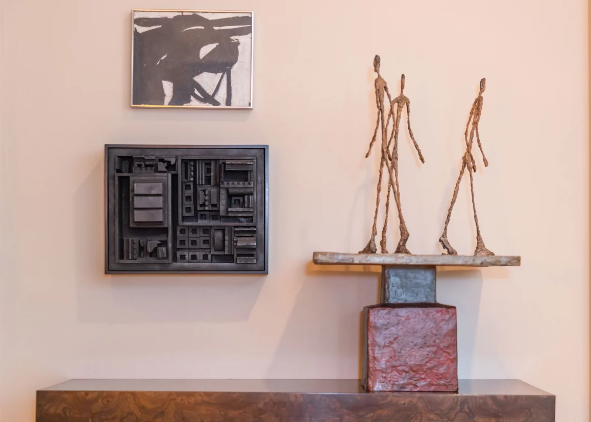 While visiting Alberto Giacometti’s Paris studio in 1951, Solinger saw “Trois hommes qui marchent (Grand plateau)”. He subsequently purchased it through Galerie Maeght, but the work was damaged in transport and sent back to the artist for repairs. Giacometti then recast and re-painted the sculpture to Solinger’s specifications. In 1962, Solinger gave Giacometti’s “Monumental Head” (1960) to MoMA.