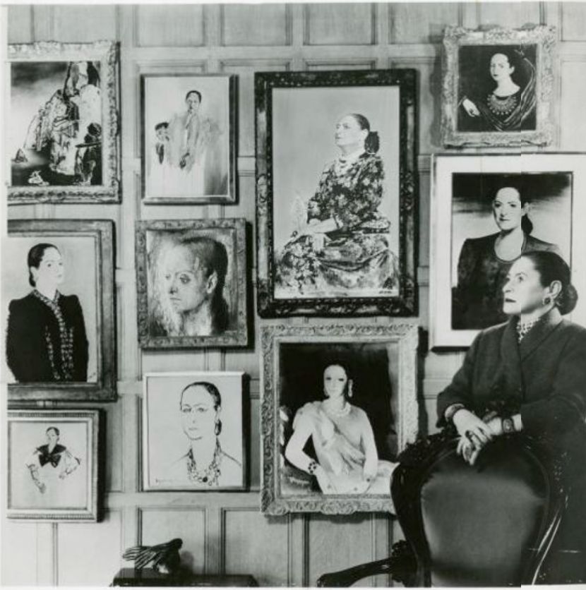 Rubinstein with her portrait collection; L-R from top: Salvador Dalí, Christian Bérard, Graham Sutherland, Roberto Montenegro, Marcel Vertes, Pavel Tchelitchew, Candido Portinari, Raoul Dufy, Margherita Russo, and Marie Laurencin. Picasso refused to paint her portrait but did forty drawings of her in the 1950s.