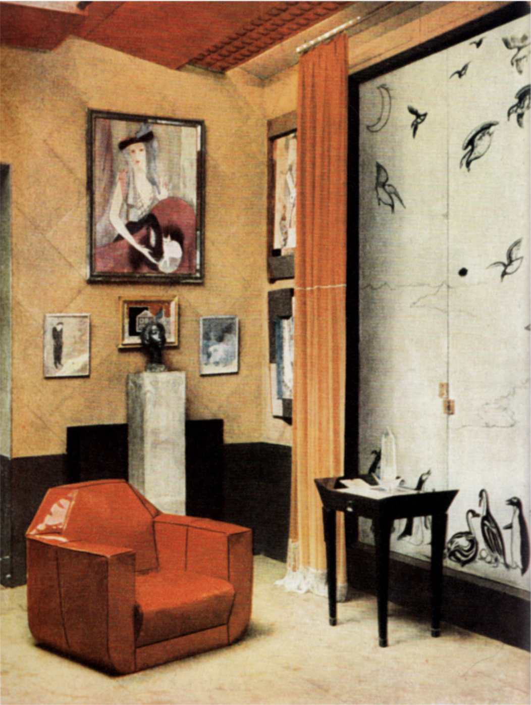 Image: Henri Rousseau, “The Snake Charmer” (1907); Sofa by Marcel Coard; Carpet by Pierre Legrain; Pablo Picasso, “Man with Guitar” (1912); Bilboquet table by Eileen Gray; Ebony cartonnier by Pierre Legrain with lacquer panels; Giorgio de Chirico, “Metaphysical Composition with Toys” (1914); Amadeo Modigliani, “The Pink Blouse” (1919); Sculptures by Modigliani and Jean Chauvin