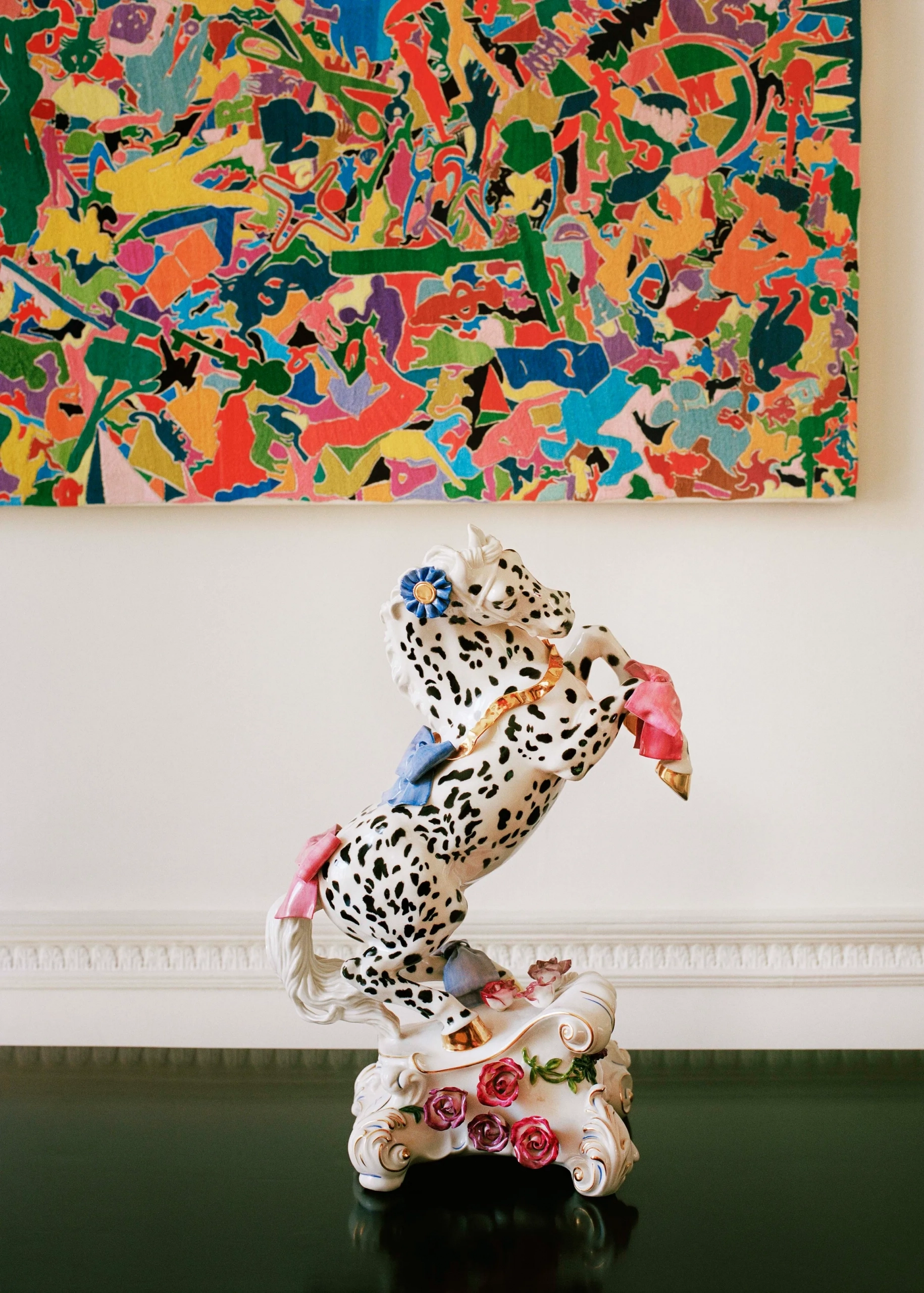 A Nymphenburg porcelain sculpture by Karen Kilimnik below an embroidered canvas by Alighiero e Boetti 5/24