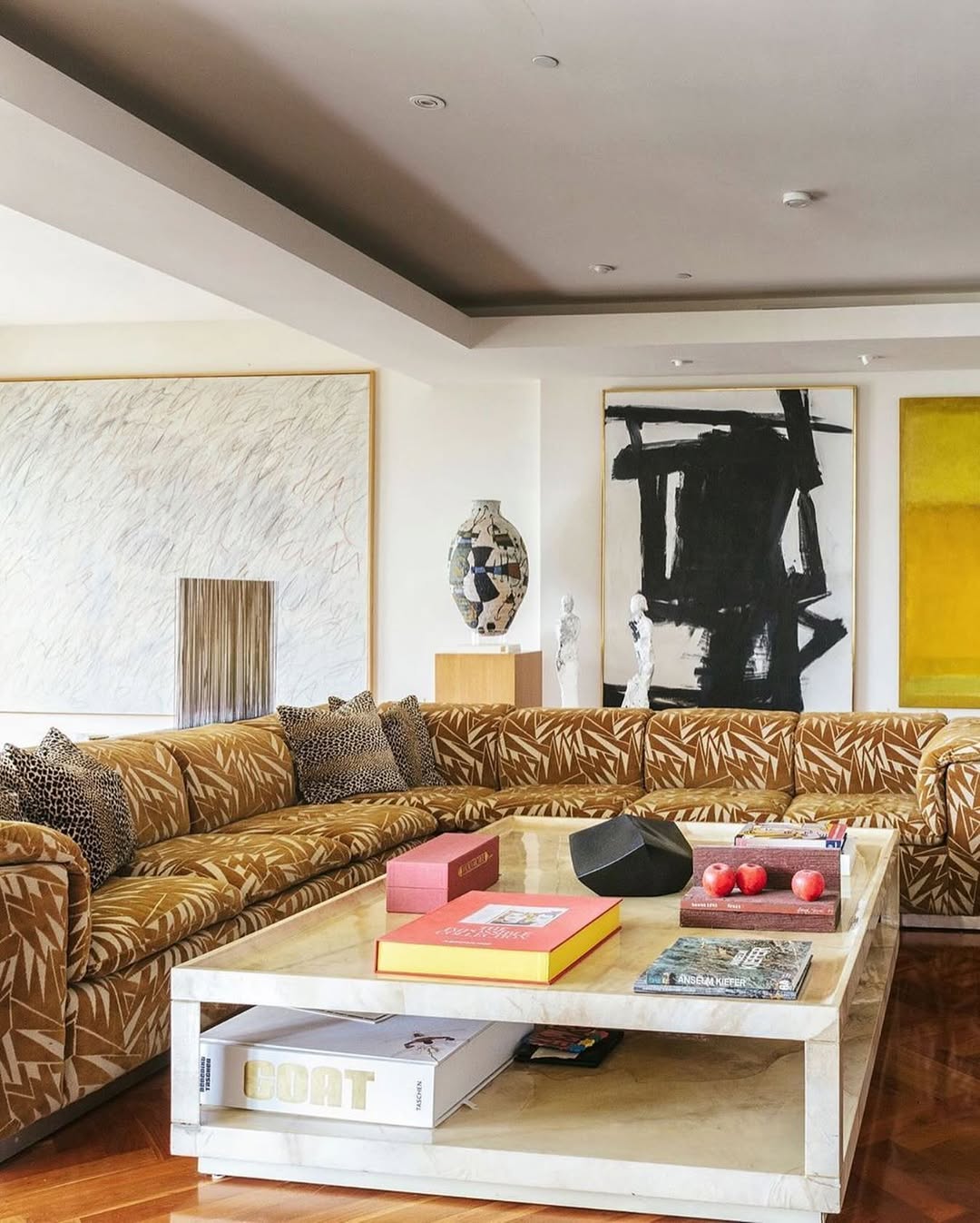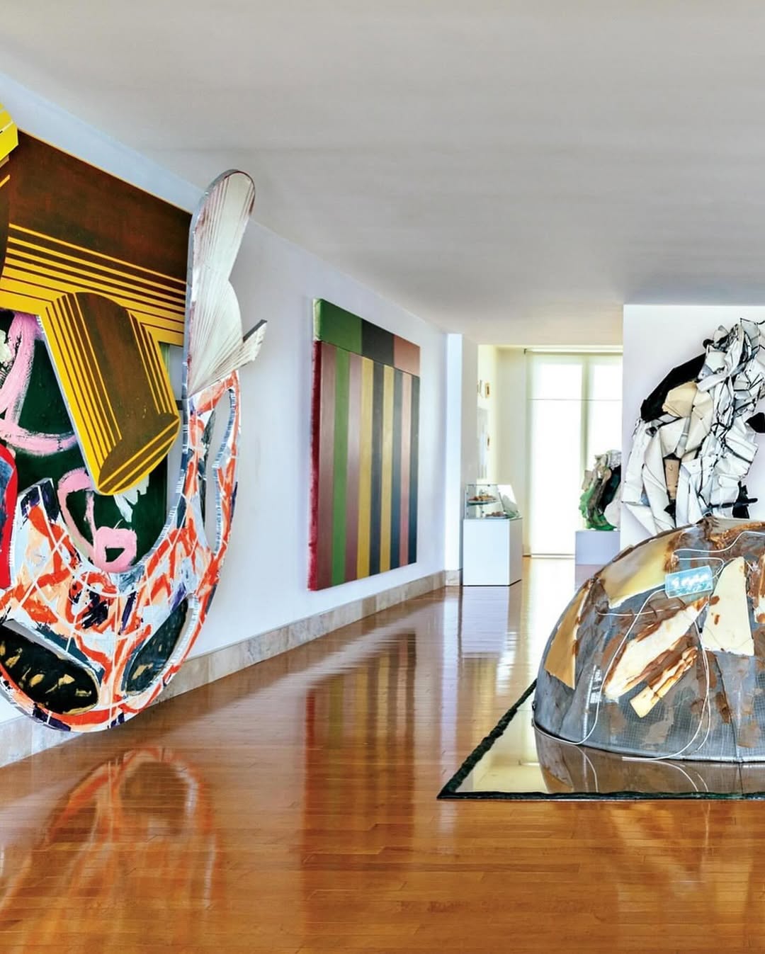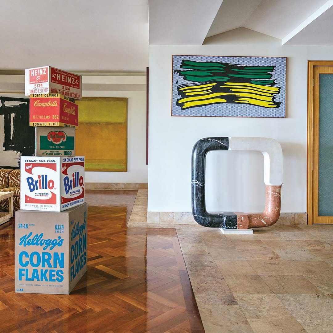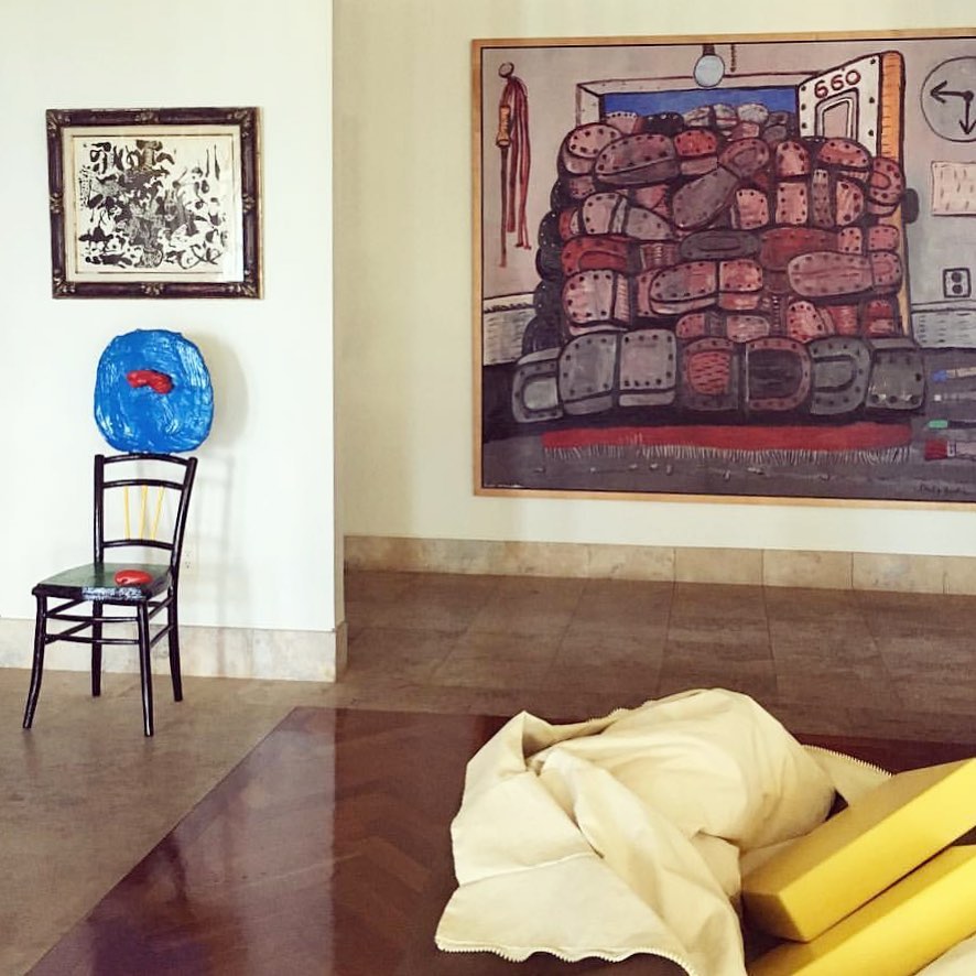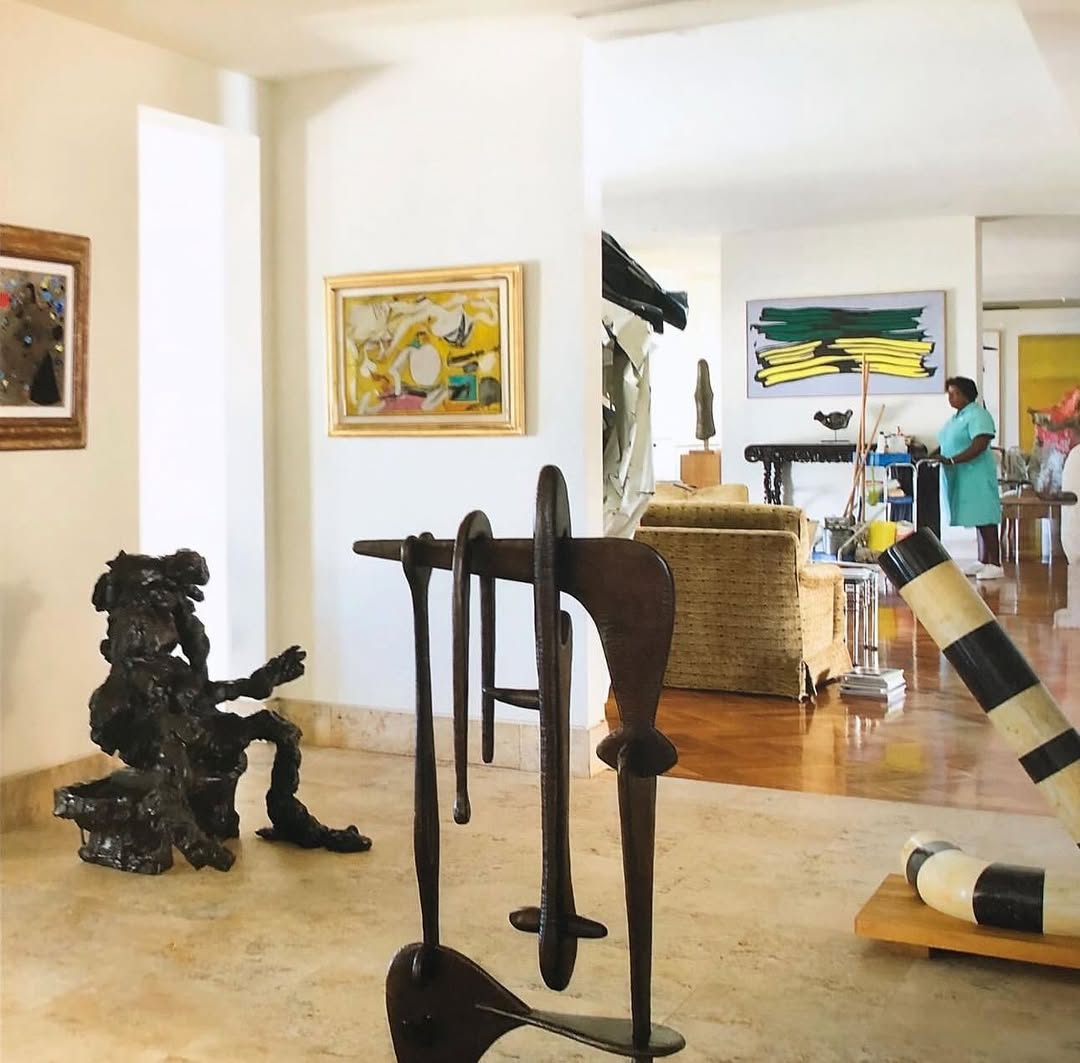 In the foreground from left to right is Joan Miró, “Femme dans la nuit” (1940), Willem de Kooning, “Fire Island” (1946) on the wall and “Seated Woman on a Bench” (1972) on the floor, Isamu Noguchi “Remembrance” (1944) and “The Bow” (1973). In the back is Lichtenstein, “Yellow and Green Brushstrokes” (1966) and Duane Hanson, “Cleaning Woman (Queenie)” (1980)